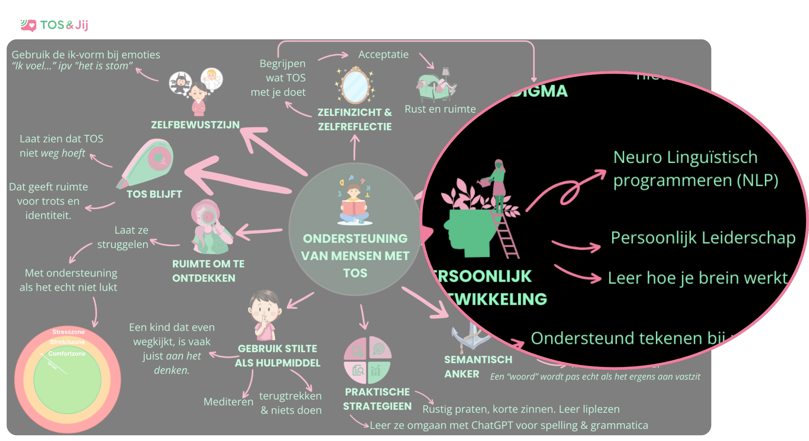 Iemand met TOS heeft geen defect brein, maar een ander bedraad brein. Zolang een kind denkt: “Ik ben dom want ik snap het niet,” zit het vast. Zodra een kind leert: “Mijn taalcentrum werkt trager, dus ik heb bedenktijd nodig,” pakt het de regie.