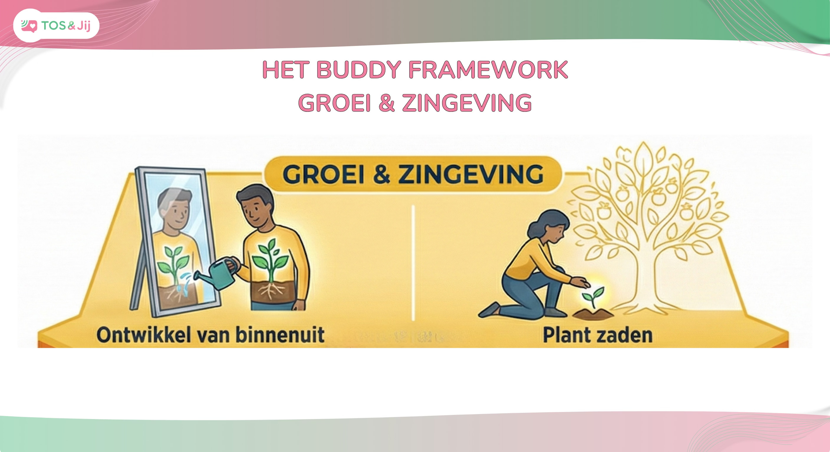 We reiken oplossingen aan (we geven ze een vis), zodat ze de dag doorkomen. Maar bij de Stichting TOS & Jij gaan we voor duurzame impact. Dat noemen we de Gele Zone: Groei & Zingeving.